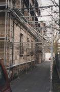 Der Treppenturm sorgt am Fassadengerüst für einen sicheren Zugang und Transportweg für Werkzeug und Kleinmaterial.